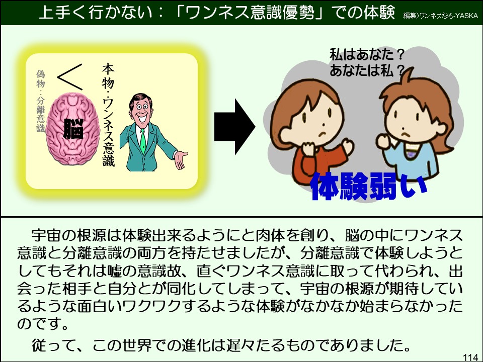 宇宙の根源は体験できるようにと肉体を創り、脳の中にワンネス意識と分離意識の両方を持たせましたが、分離意識で体験しようとしても、それは嘘の意識ゆえ、すぐワンネス意識に取って代わられ、出会った相手と自分とが同化してしまって、宇宙の根源が期待しているような、面白いワクワクするような体験がなかなか始まらなかったのです。
