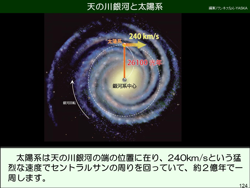 太陽系は天の川銀河の端の位置にあり、240km/sという、猛烈な速度でセントラルサンの周りを回っていて、約2億年で1周します。