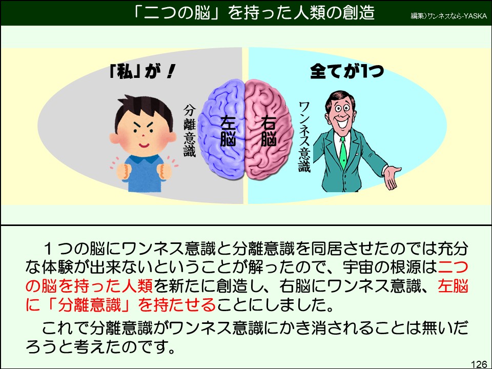 1つの脳に、ワンネス意識と分離意識を同居させたのでは、充分な体験が出来ないということが解ったので、宇宙の根源は2つの脳を持った人類を新たに創造し、右脳にワンネス意識、左脳に「分離意識」を持たせることにしました。