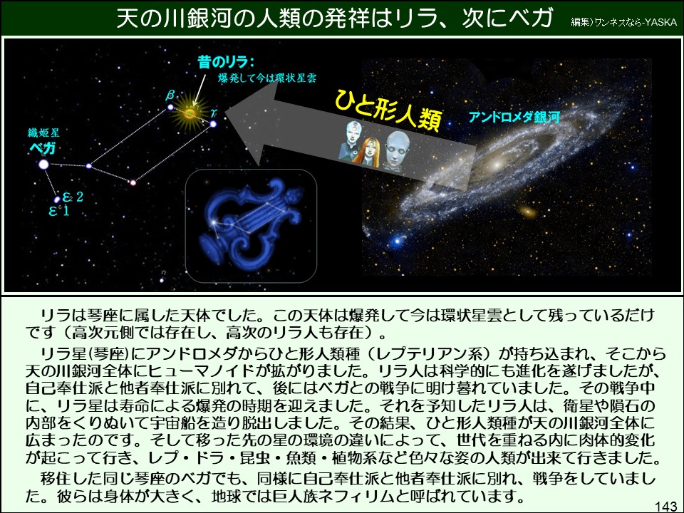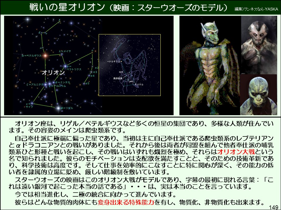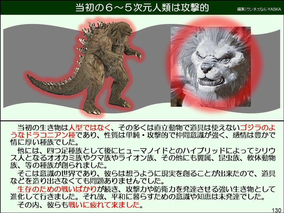 他には、4つ足種族として後に、ヒューマノイドとのハイブリッドによって、シリウス人となるオオカミ族やクマ族やライオン族、その他にも翼族、昆虫族、軟体動物族などの種族が創られました。