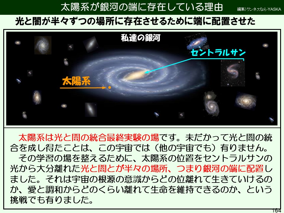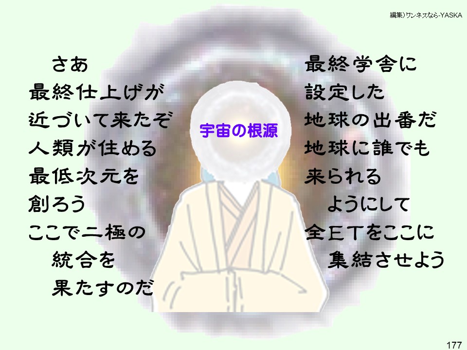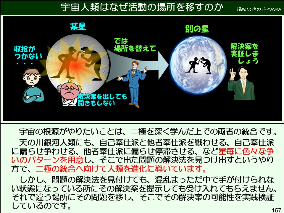 そのため、ワンネスに向かって、地球より進化している(より宇宙の根源に近付いている)とは言え、魂として足腰が弱く、その結果、宇宙全体が停滞している状況なのです。
