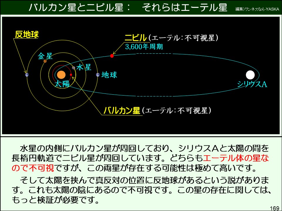 水星の内側に、バルカン星が周回しており、シリウスAと太陽の間を長楕円軌道でニビル星が周回しています。