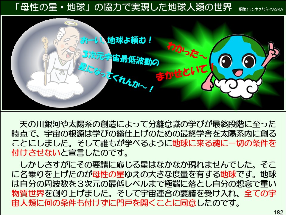 天の川銀河や太陽系の創造によって、分離意識の学びが最終段階に至った時点で、宇宙の根源は学びの総仕上げのための最終学舎を太陽系内に創ることにしました。