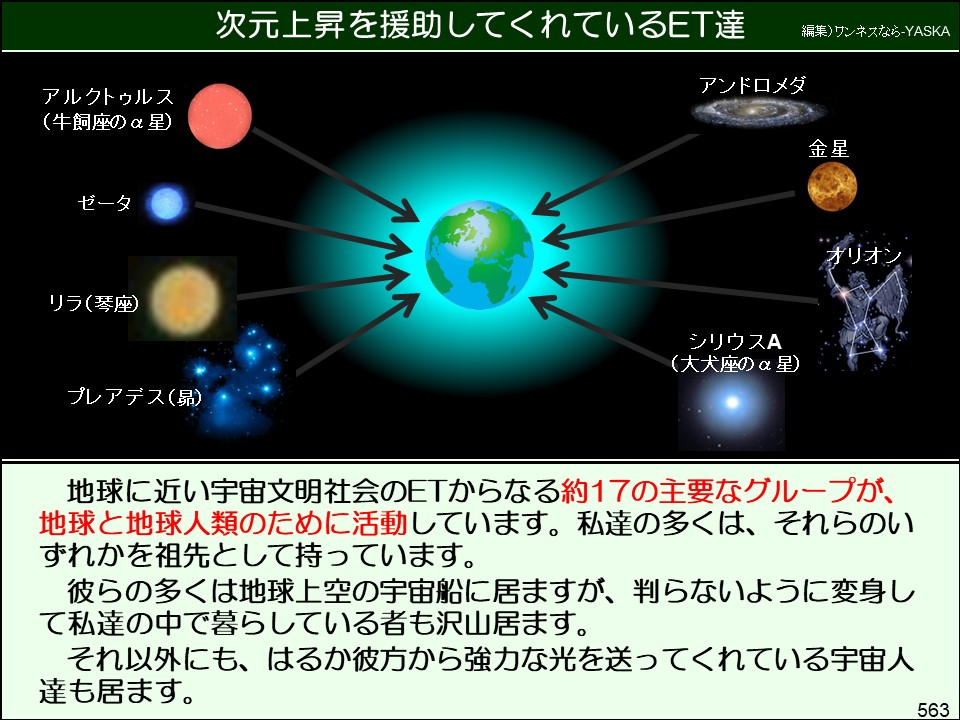 地球に近い宇宙文明社会のETからなる、約17の主要なグループが、地球と地球人類のために活動しています。