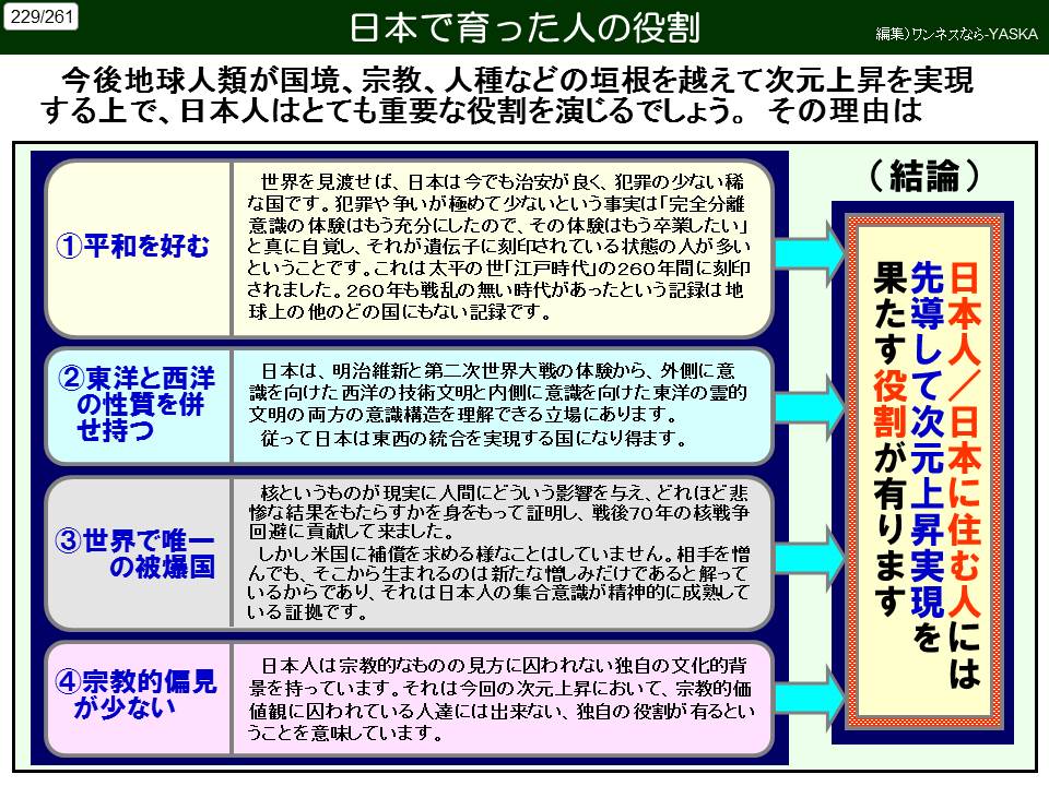 今後、地球人類が国境、宗教、人種などの垣根を越えて次元上昇を実現するうえで、日本人はとても重要な役割を演じるでしょう。